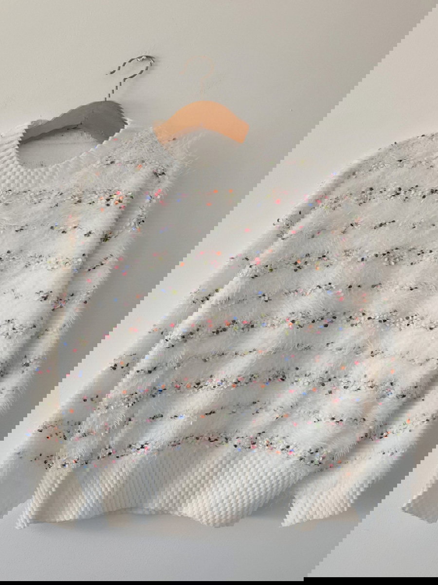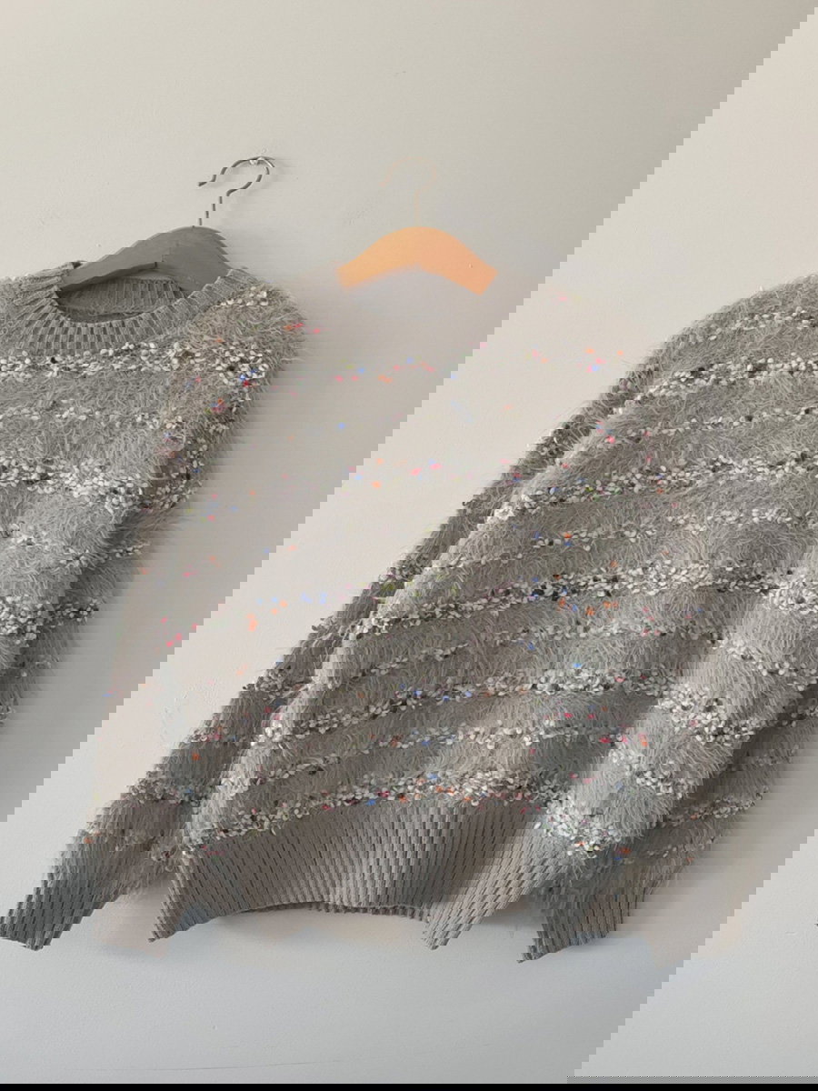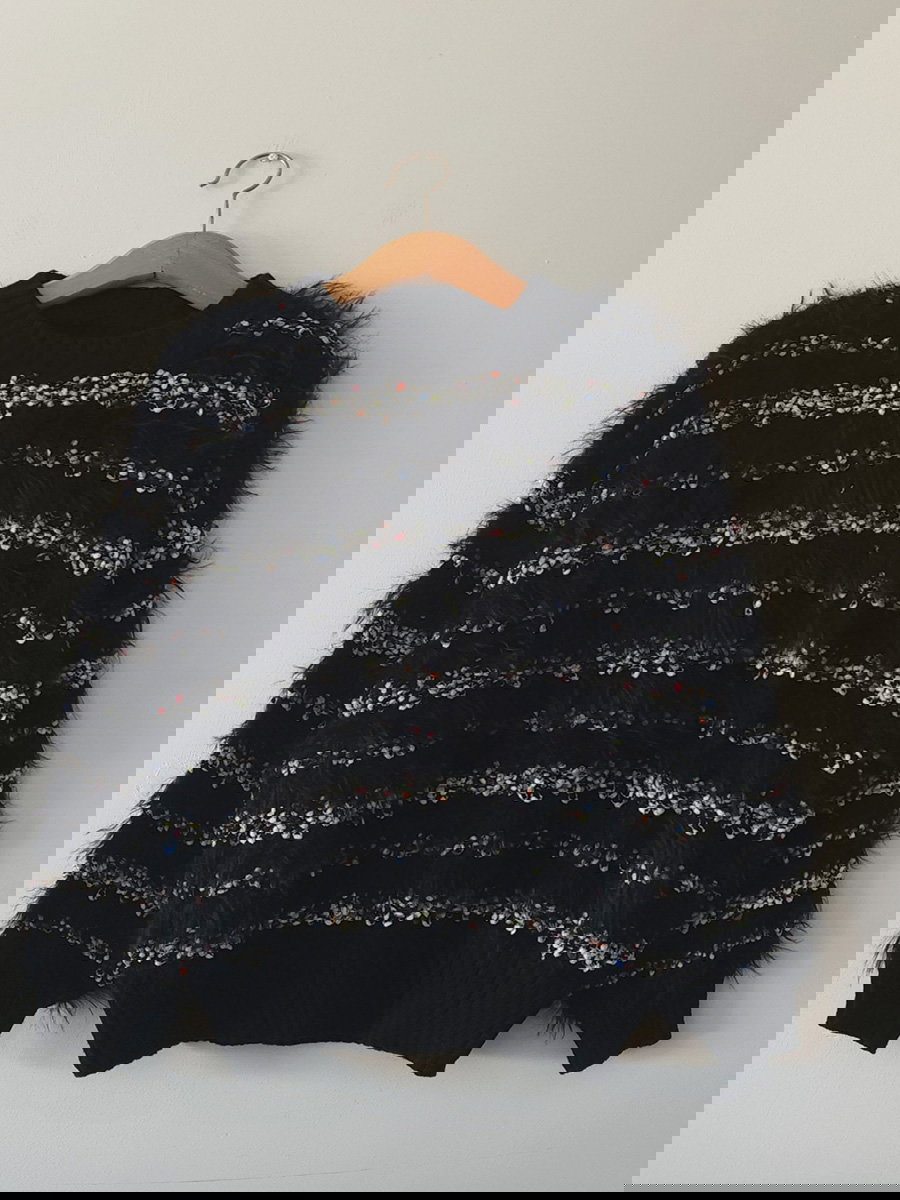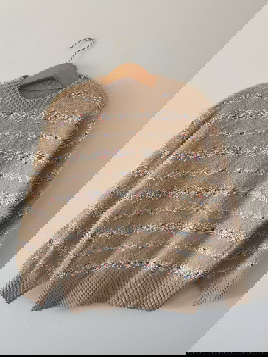 Suéter de tejido con superficie texturada y volumen, silueta recta y largo medio. Escote redondo. Presenta franjas horizontales con hilado en relieve.